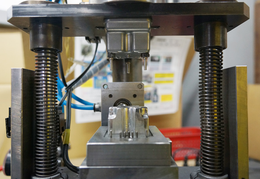 部品の石づまりはないか、平面が均等であるか、ボスは折れて無いかを一度に検査し、良品であればチェックを行った印が打刻されます。